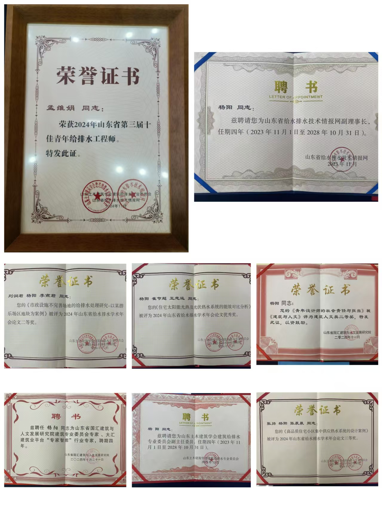 各位專業(yè)人員齊聚年會,圍繞給排水行業(yè)發(fā)展,分享各自實踐經(jīng)驗,探尋行業(yè)高質(zhì)量發(fā)展的方法與途徑。我公司給排水設(shè)計人員榮獲多個獎項。孟維娟榮獲“山東省十佳青年給排水工程師”稱號。楊陽被聘為山東土木建筑學(xué)會建筑給排水專業(yè)委員會副主任委員、山東省給水排水技術(shù)情報網(wǎng)副理事長、山東省國匯建筑與人文發(fā)展研究院建筑專業(yè)委員會專家、大匯建筑業(yè)平臺“專家智庫”行業(yè)專家。劉潤君、楊陽、李燕君撰寫論文《市政設(shè)施不完善場地的給排水處理研究-以某游樂場區(qū)地塊為案例》被評為 2024年山東省給水排水學(xué)術(shù)年會論文二等獎。張帥、楊陽、張晨晨撰寫的論文《高品質(zhì)住宅小區(qū)集中供應(yīng)熱水系統(tǒng)的設(shè)計案例》被評為 2024 年山東省給水排水學(xué)術(shù)年會論文三等獎。楊陽、崔節(jié)超、王志遠(yuǎn)撰寫的論文《住宅太陽能光熱及光伏熱水系統(tǒng)的能效對比分析》被評為2024年山東省給水排水學(xué)術(shù)年會論文優(yōu)秀獎。楊陽撰寫的《青年設(shè)計師的社會責(zé)任與擔(dān)當(dāng)》被《建筑與人文》評為建筑人文類二等獎。