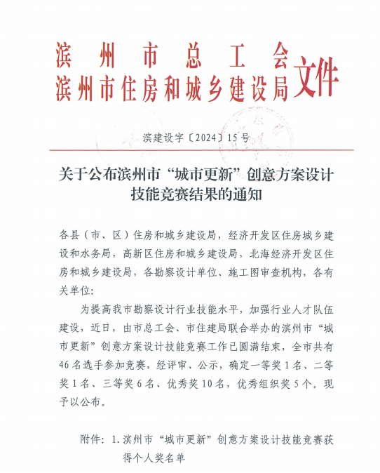 2024年10月,在濱州市總工會、濱州市住房和城鄉(xiāng)建設(shè)局共同主辦,濱州市勘察設(shè)計協(xié)會、濱州建筑工程施工圖審查中心承辦的濱州市“城市更新”創(chuàng)意方案設(shè)計技能競賽中,公司員工憑借出色的創(chuàng)意和專業(yè)的技能脫穎而出,參賽的9名員工全部獲獎,囊括一、二等獎,另外3人獲三等獎,4人獲優(yōu)秀獎,公司獲得優(yōu)秀組織獎。本次競賽活動主題為“聚力創(chuàng)新發(fā)展,賦能強市建設(shè)—濱州市城市更新設(shè)計探索”。